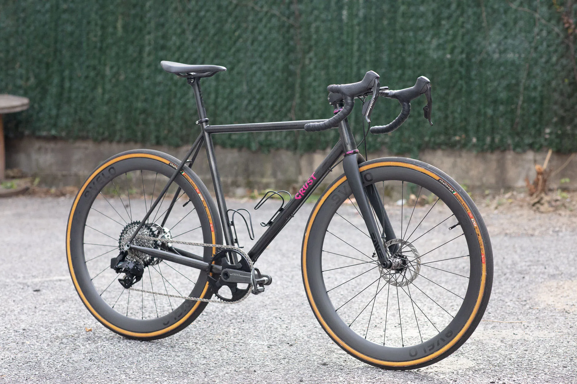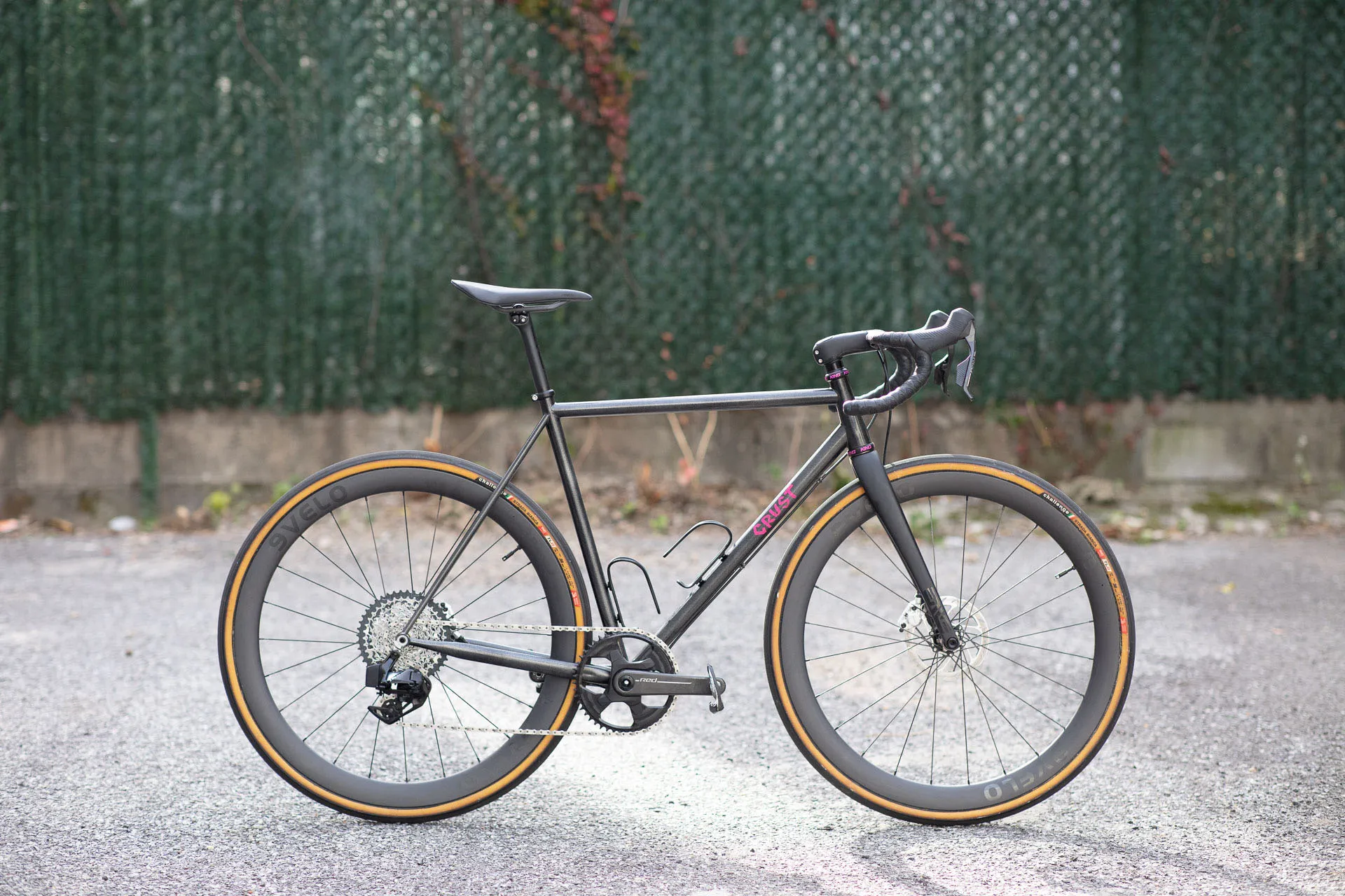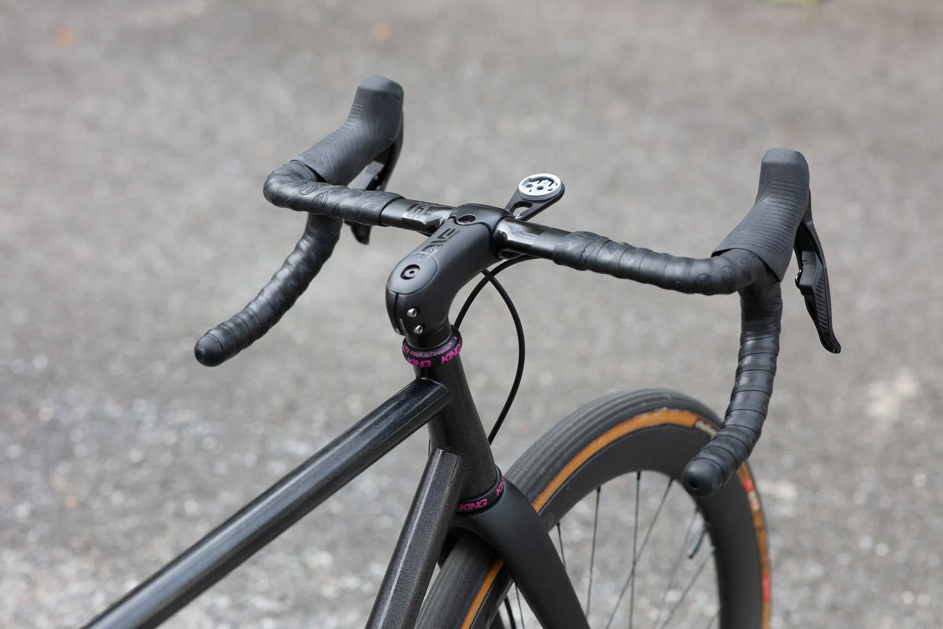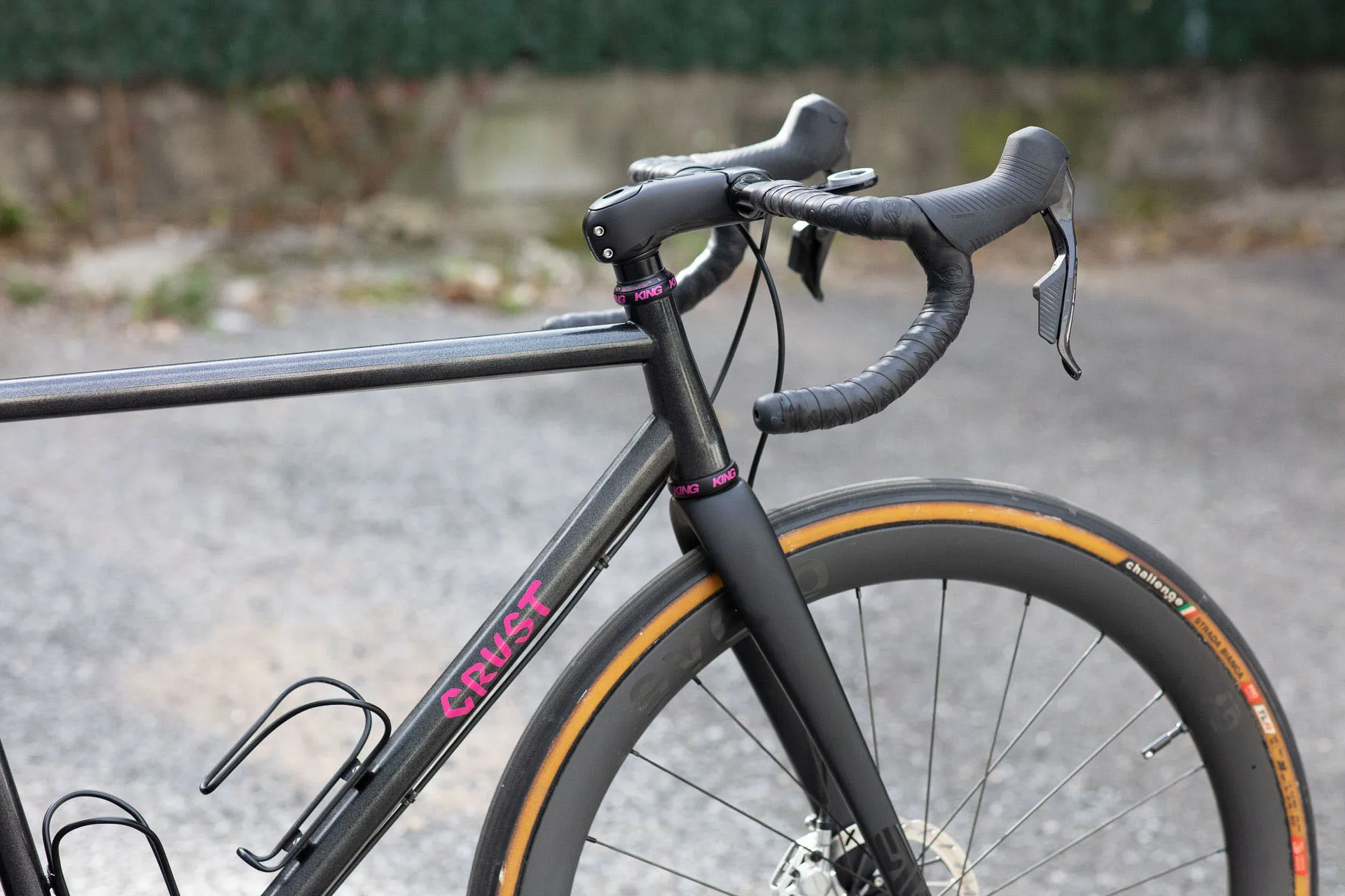 The frame is built for Crust by Darren Larkin (LARKIN CYCLES) from an unknown assortment of Columbus tubes. ENVE AR fork for "monster road" tire clearance. Extra wide carbon wheels for the aero gains. Matching Enve AR bars and zero offset seatpost give some additional flex and save a bit more weight. This build is light but stable with a slack headtube and low BB. The frame is eTap/AXS specific with no cable stops for mechanical shifting - the rear brake hose still runs fully external though for no fuss setup/breakdown. Will handle even the worst pavement with ease and could do gravel duty with a quick tire swap - ready to ride!