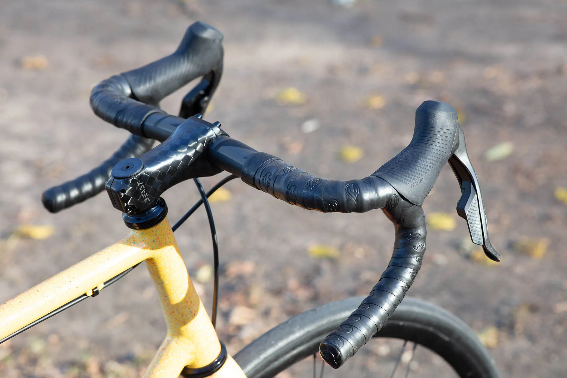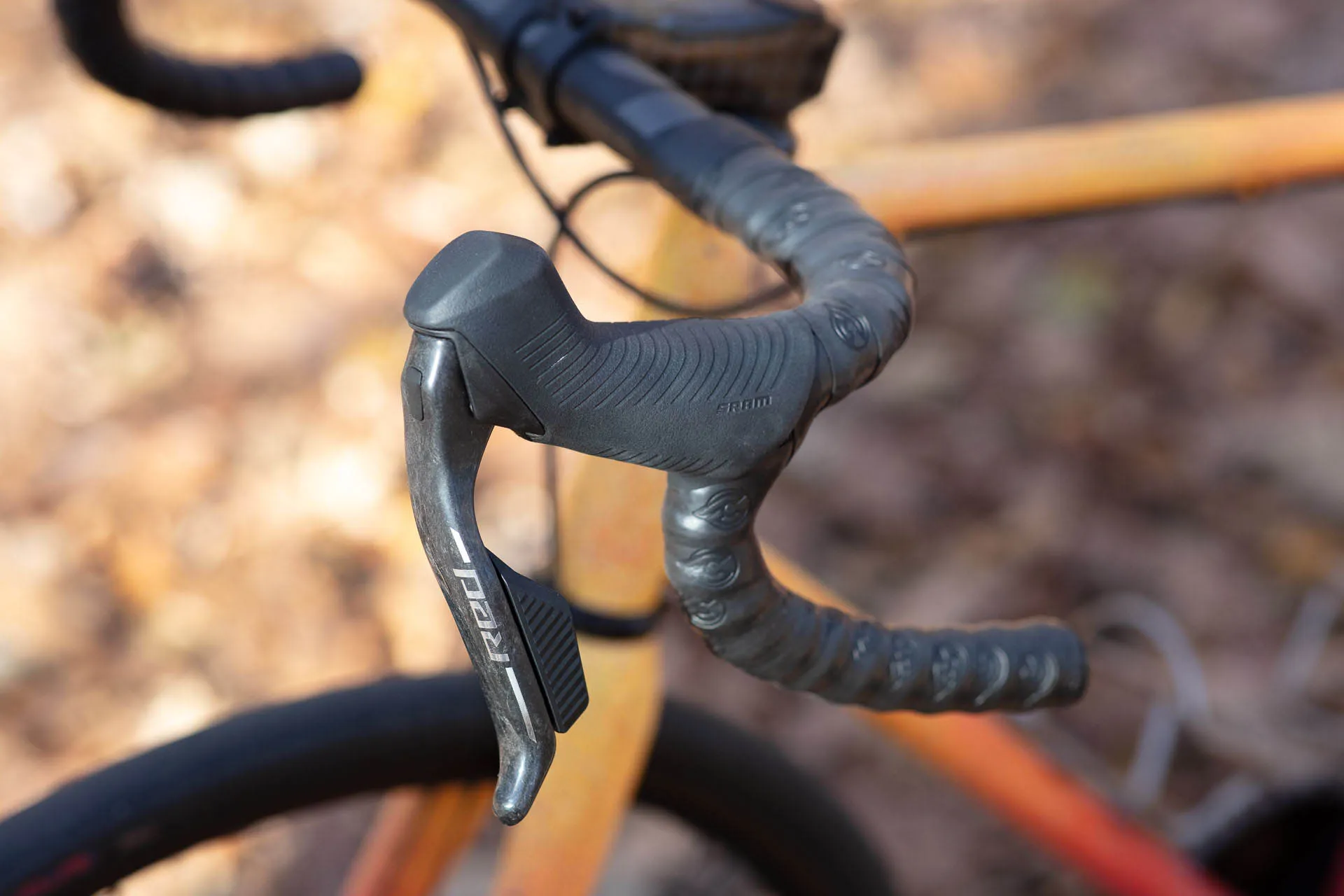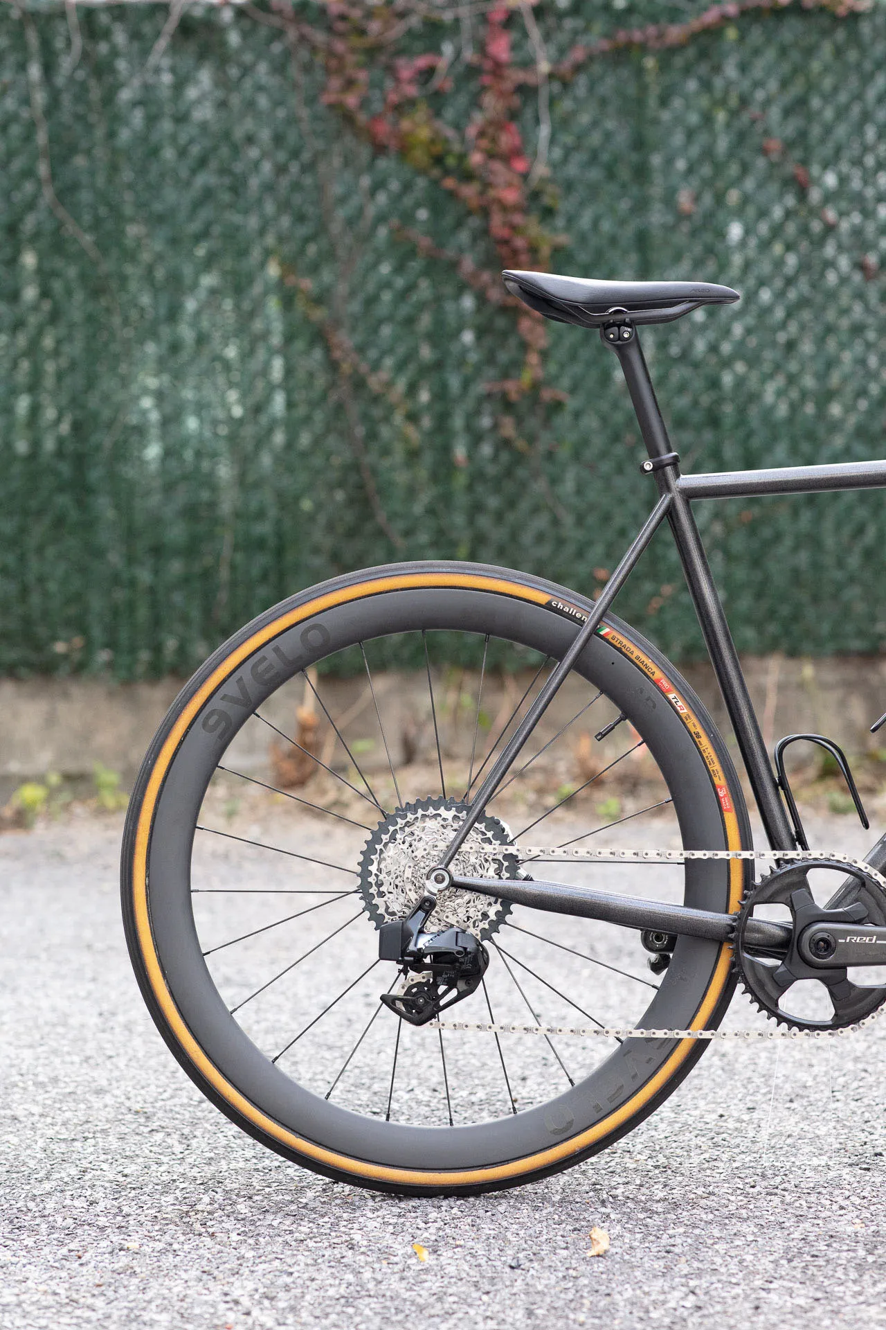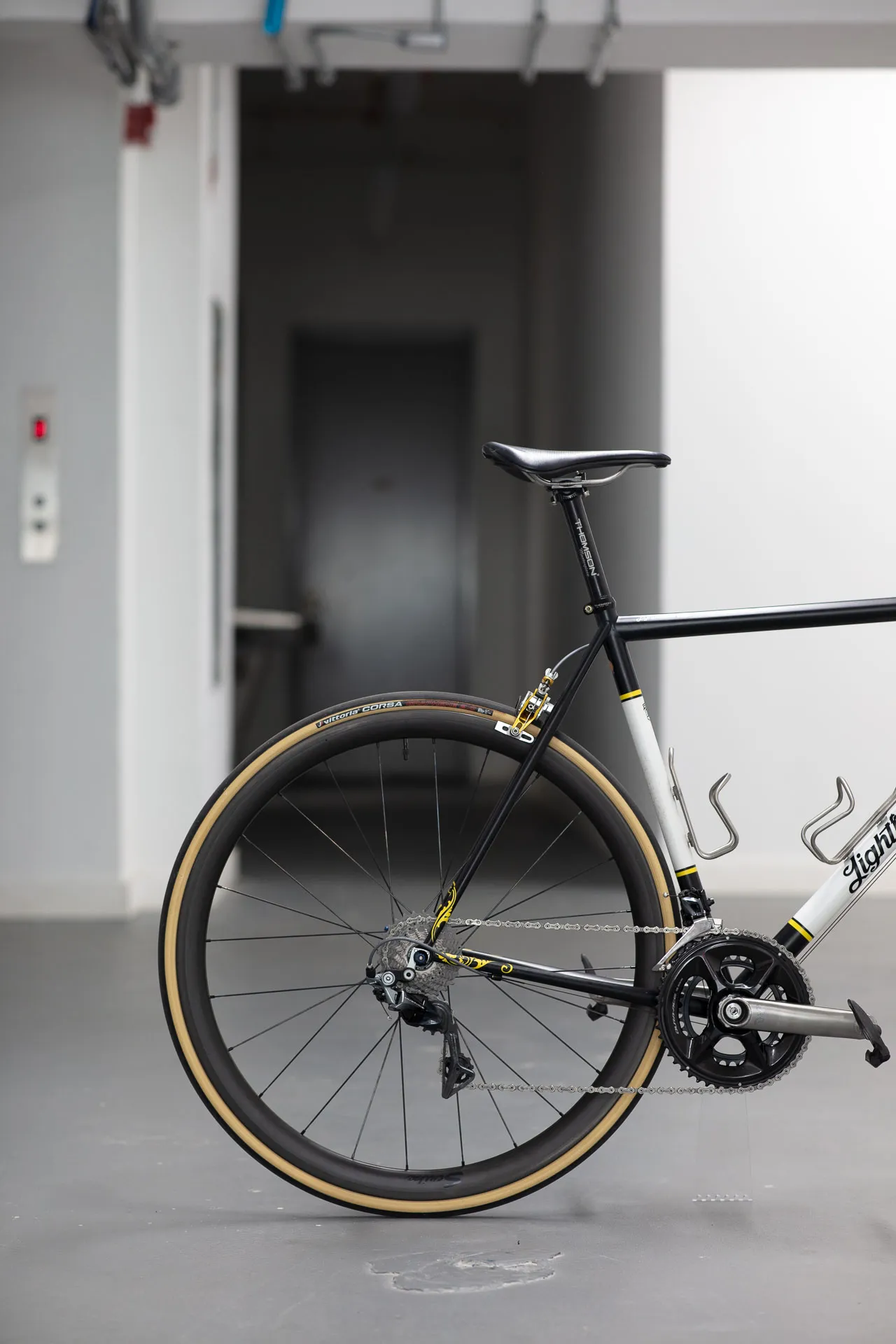 The frame is built for Crust by Darren Larkin (LARKIN CYCLES) from an unknown assortment of Columbus tubes. ENVE AR fork for "monster road" tire clearance. Extra wide carbon wheels for the aero gains. Matching Enve AR bars and zero offset seatpost give some additional flex and save a bit more weight. This build is light but stable with a slack headtube and low BB. The frame is eTap/AXS specific with no cable stops for mechanical shifting - the rear brake hose still runs fully external though for no fuss setup/breakdown. Will handle even the worst pavement with ease and could do gravel duty with a quick tire swap - ready to ride!