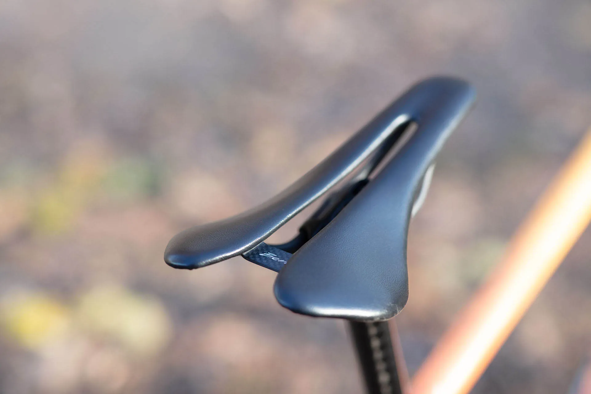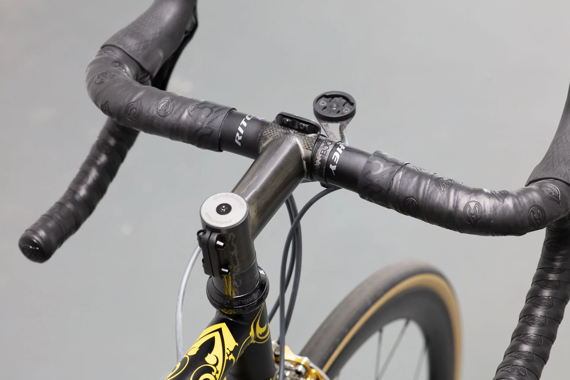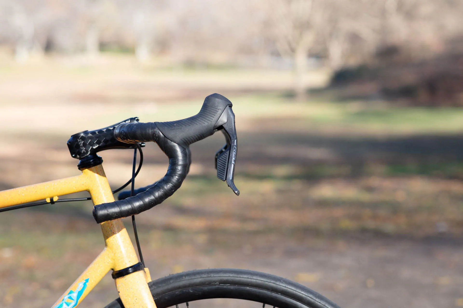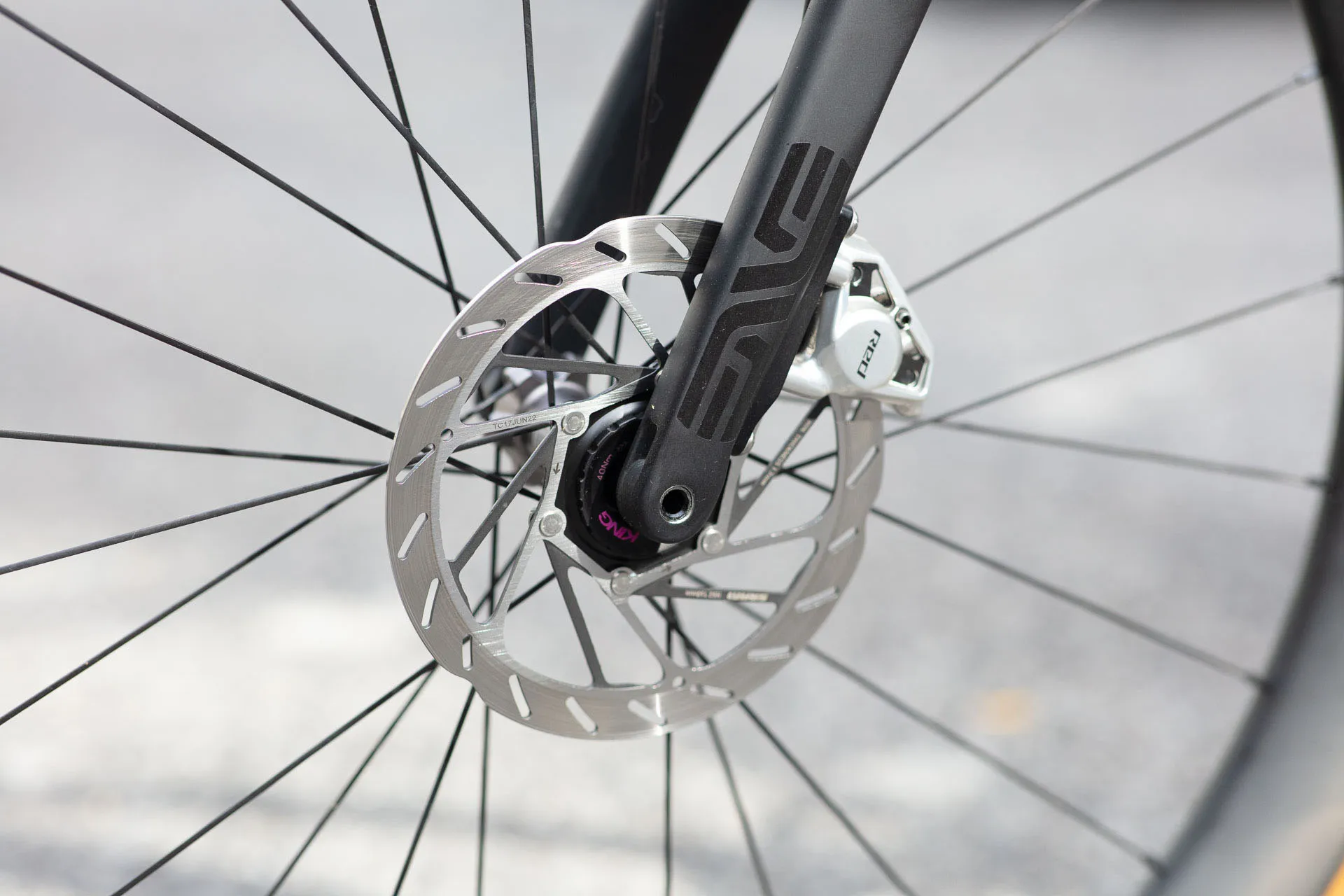 The frame is built for Crust by Darren Larkin (LARKIN CYCLES) from an unknown assortment of Columbus tubes. ENVE AR fork for "monster road" tire clearance. Extra wide carbon wheels for the aero gains. Matching Enve AR bars and zero offset seatpost give some additional flex and save a bit more weight. This build is light but stable with a slack headtube and low BB. The frame is eTap/AXS specific with no cable stops for mechanical shifting - the rear brake hose still runs fully external though for no fuss setup/breakdown. Will handle even the worst pavement with ease and could do gravel duty with a quick tire swap - ready to ride!