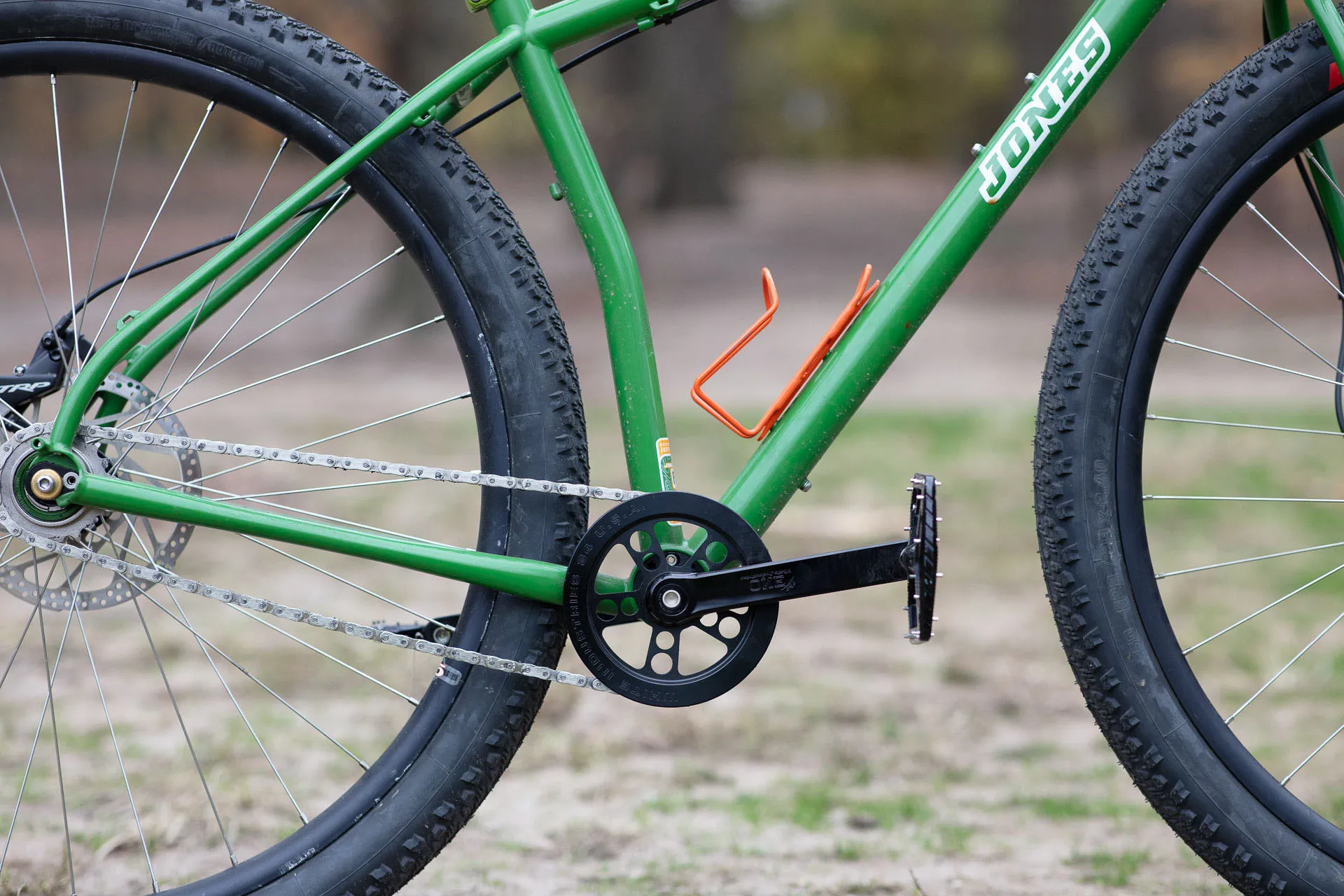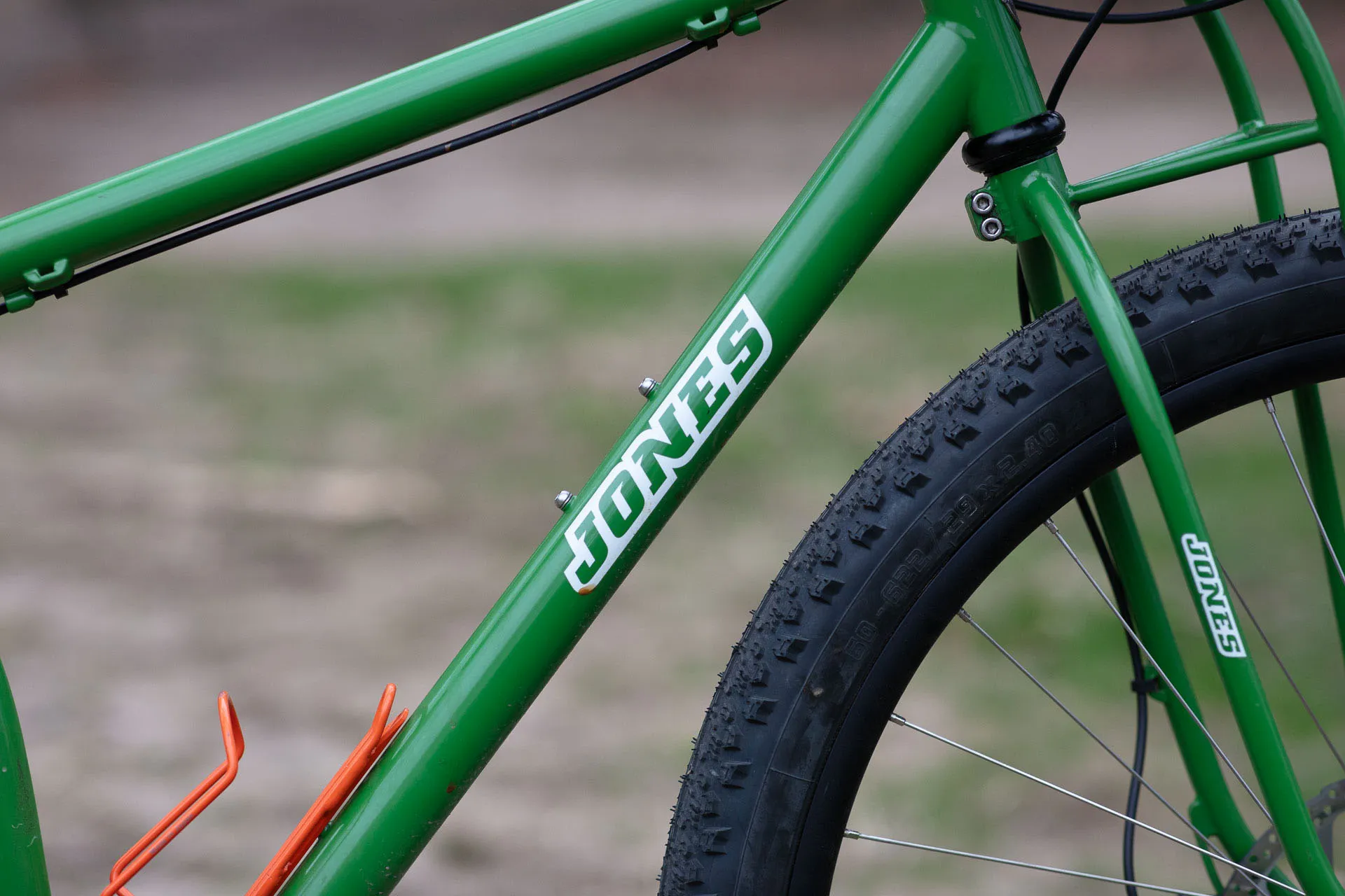 An early (pre-SWB) Jones hardtail with matching truss fork. Paul single speed rear hub and matching (unobtanium) 135 qr Paul hub made for these Jones forks. Hubs are laced to Blunt 35 rims rolling on Vittoria Peyote rubber - fast and comfy. Rear mech hanger is shaved for SS application and eccentric bottom bracket controls chain tension. White Industries ENO cranks, bashguard chainring, and trials freewheel complete the drivetrain. Stopping is handled by TRP (DH-R EVOs). Jones titanium bars match the Thomson titanium seatpost quite well and Thomson stem rounds out the cockpit. Some other small details - Rockgiest H-Bar specific handlebar bag, Paul skewers, and a lovely orange Tanaka bottle cage. This bike does everything well and is a blast as a commuter or on single track. With the right bags I think it would make an excellent bike packer as well <3